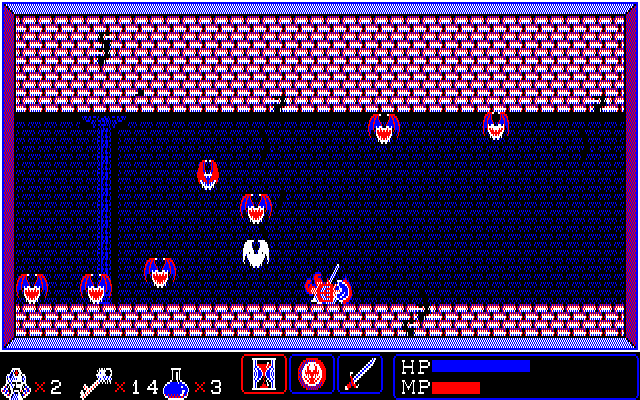 お金やショップの要素がなく、広いマップにちりばめられたアイテムや魔法を取得しながら進むという、シンプルかつ遊びやすいゲームシステムは本作ならではの特徴。しかし武器や盾は取得と同時に自動的に装備してしまうので、発見した武器は現在の装備と比較してから取得(装備)しましょう。とはいえ、間違えて武器や盾を装備してしまったとしても再度部屋に入り直せば以前のアイテムを再装備できるので、ご安心を……。