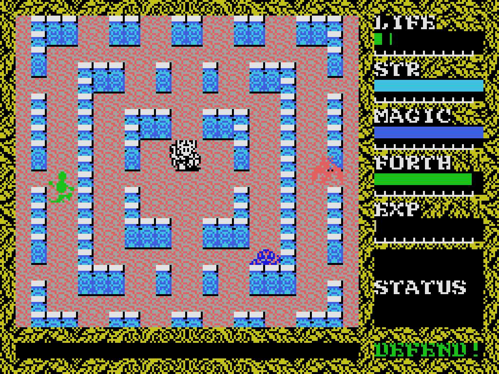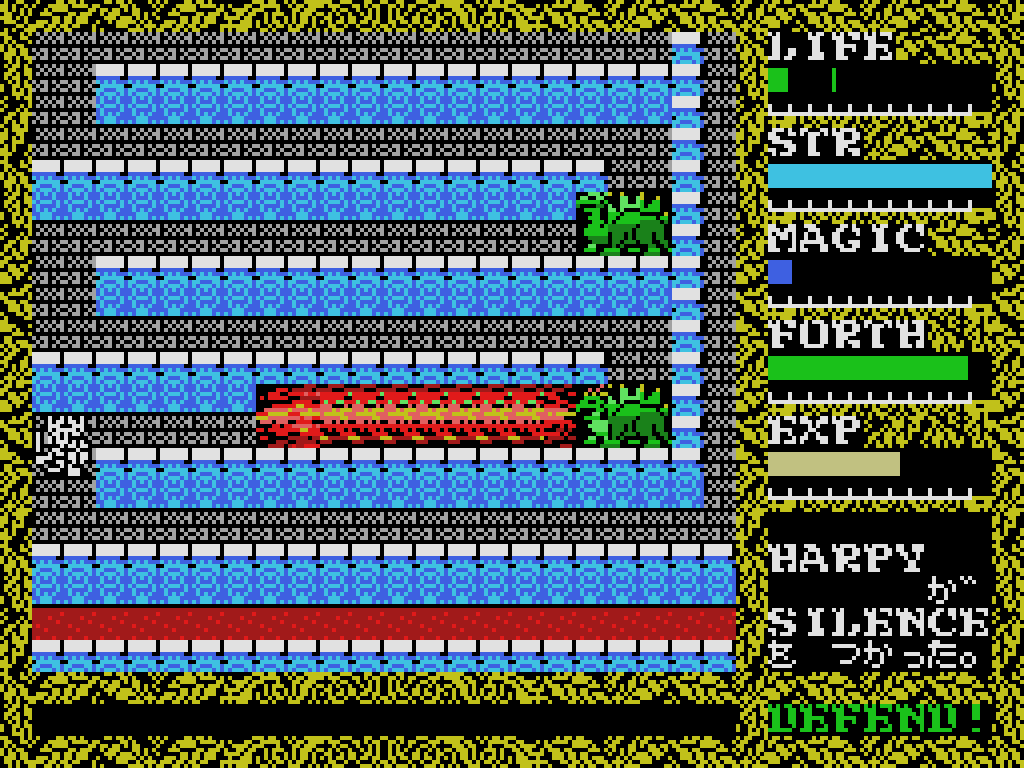 当時、アクティブRPGと称されていたことからもわかるように、本作ではアクション性がキモ。プレイヤーは攻撃モードと防御モードを切り替えながらジムをモンスターに体当たりさせて戦うことになります。モンスターを倒せは経験値が手に入り、経験値を溜めることでジムはレベルアップしてより強くなっていきます。またジムが傷ついてしまったときは、平地などで休ませることで自動的に体力が回復する仕組みとなっています。