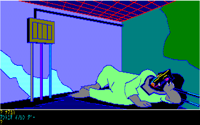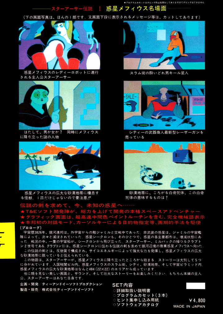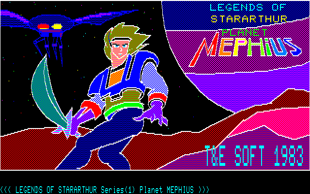 本作は1983年にリリースされたアドベンチャーゲーム。プレイヤーはスターアーサーとなって、惑星メフィウスを舞台に伝説のレイソードを探す冒険を繰り広げることになります。ゲームはカナ入力によるコマンド入力方式&カーソル選択方式を採用。例えば“タタク”+カーソルで牢屋の格子を指定するといった形で行動することになります。