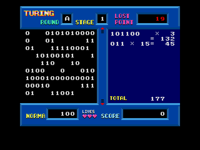 本作はDS18号に収録されていたパズルゲーム。ニ進数をテーマにしており、画面左に表示された01の数字群の先頭の2桁から8桁の数字を選択すると、選択した文字列と同じものが数字群から消えます。そして再び2桁から8桁を選択してさらに文字列を消し……これを繰り返して、すべての数字を消せばクリアとなります。なおクリア時のポイントによって次のステージが決まります。